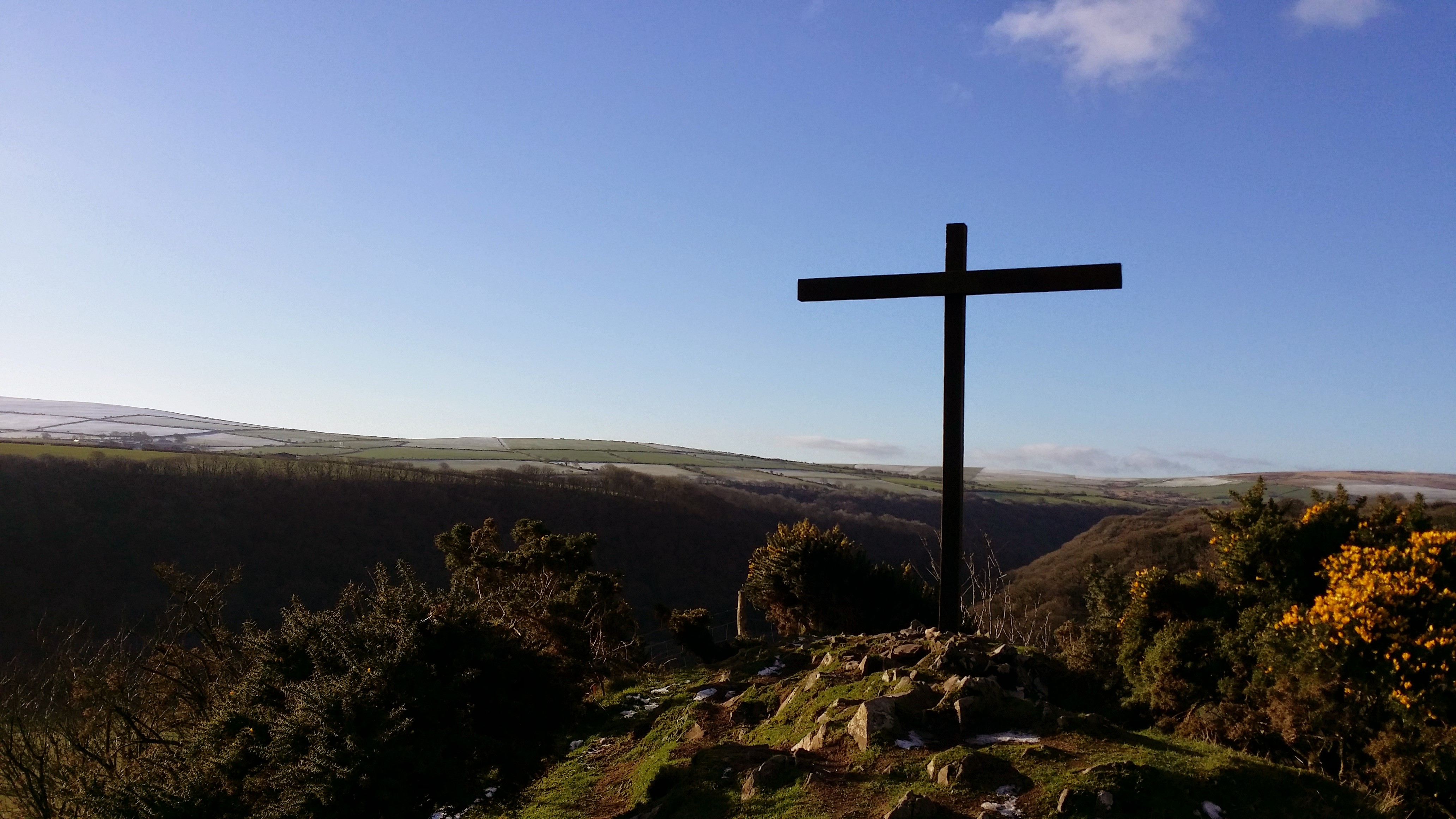 I walked on past a wooden fort, that looked like a prison to me. (Sorry, no photo). Then up the hill, through the mud, into a stunning, open field, that looked out over the valley and to the cross on the hill. I felt like this was a metaphor: the half-thawed pond was like me, a work in progress, but having been freed from things here. The fort represented the things and people that had trapped me. The field represented a ‘huge, open space’, which I was now free to run around, explore and enjoy.